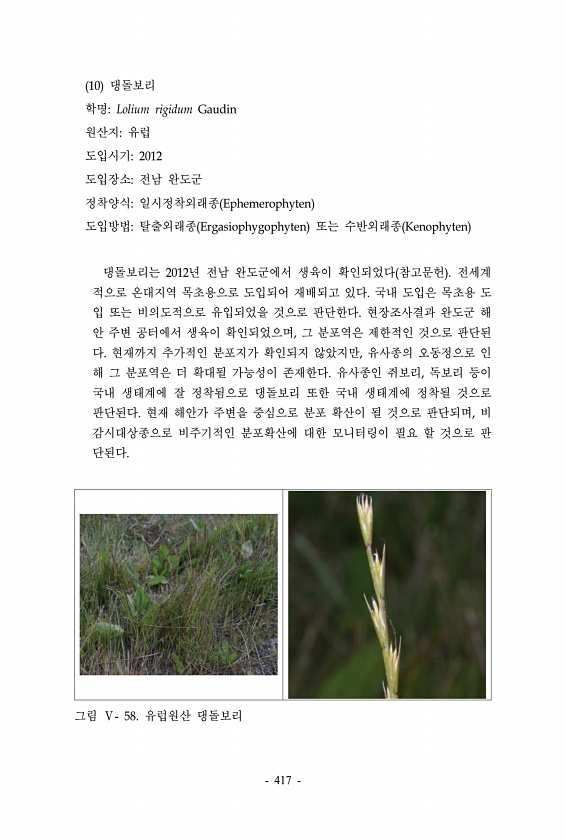 10 댕돌보리 학명Lolium rigidum Gaudin 원산지유럽 도입시기2012 도입장소전남 완도군 정착양식일시정착외래종 Ephemerophyten 도입방법탈출외래종 Ergasiophygophyten 또는 수반외래종 Kenophyten 댕돌보리는 2012년 전남 완도군에서 생육이 확인되었다 참고문헌 전세계 적으로 온대지역 목초용으로 도입되어 재배되고 있다. 국내 도입은 목초용 도 입 또는 비의도적으로 유입되었을 것으로 판단한다. 현장조사결과 완도군 해 안 주변 공터에서 생육이 확인되었으며, 그 분포역은 제한적인 것으로 판단된 다. 현재까지 추가적인 분포지가 확인되지 않았지만, 유사종의 오동정으로 인 해 그 분포역은 더 확대될 가능성이 존재한다. 유사종인 쥐보리, 독보리 등이 국내 생태계에 잘 정착됨으로 ...