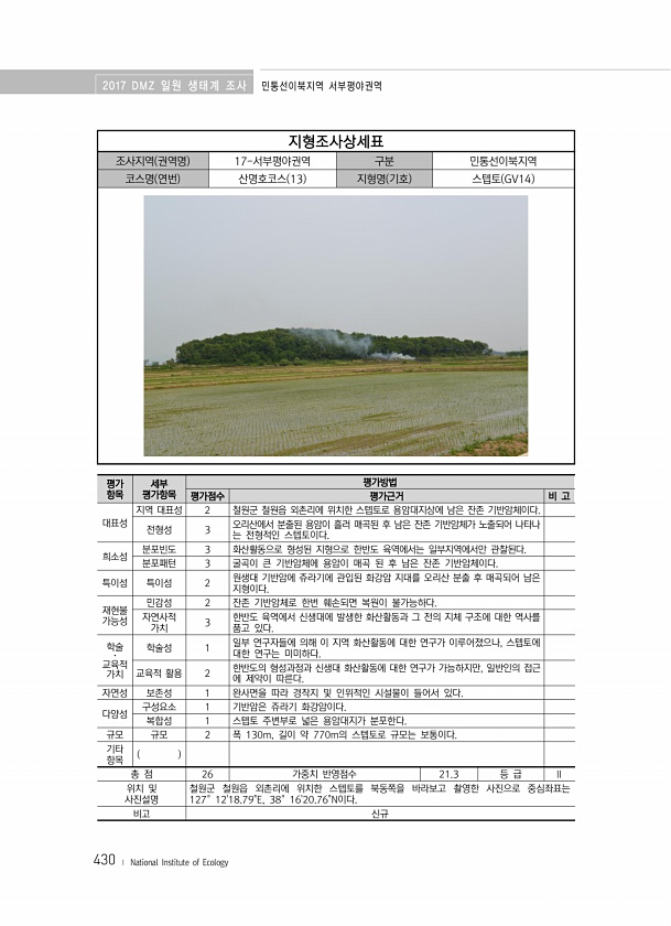 2017 DMZ 일원 생태계 조사 민통선이북지역 서부평야권역 430 ? National Institute of Ecology 지형조사상세표 조사지역 권역명 17-서부평야권역 구분 민통선이북지역 코스명 연번 산명호코스 13 지형명 기호 스텝토 GV14 평가 항목 세부 평가항목 평가방법 평가점수 평가근거 비 고 대표성 지역 대표성 2 철원군 철원읍 외촌리에 위치한 스텝토로 용암대지상에 남은 잔존 기반암체이다. 전형성 3 오리산에서 분출된 용암이 흘러 매곡된 후 남은 잔존 기반암체가 노출되어 나타나 는 전형적인 스텝토이다. 희소성 분포빈도 3 화산활동으로 형성된 지형으로 한반도 육역에서는 일부지역에서만 관찰된다. 분포패턴 3 굴곡이 큰 기반암체에 용암이 매곡 된 후 남은 잔존 기반암체이다. 특이성 특이성 2 원생...