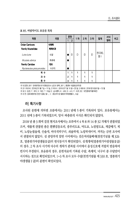 II. 조사결과 www.nie.re.kr ?425 학명 국명 문헌 1 차 2 차 3 차 합계 서식 1 2 형태 비고 Order Carnivora 식육목 Family Mustelidae 족제비과 Lutra lutra 수달 ● D D D D 천 330, 멸Ⅰ Mustela sibirica 족제비 ● Family Canidae 개과 Nyctereutes procyonoides 너구리 ● 목 수 1 1 1 1 1 과 수 2 1 1 1 1 종 수 3 1 1 1 1 표 85. 바람막이도 포유류 목록 주 1 문헌2011 전국무인도서 자연환경조사 신안 6 권역, 2011, 환경부 국립환경과학원 주 2 1 차조사 2018 년 5 월 7 일 11 일, 2 차조사 2018 년 7 월 16 일 20 일, 3 차조사 2018 년 ...