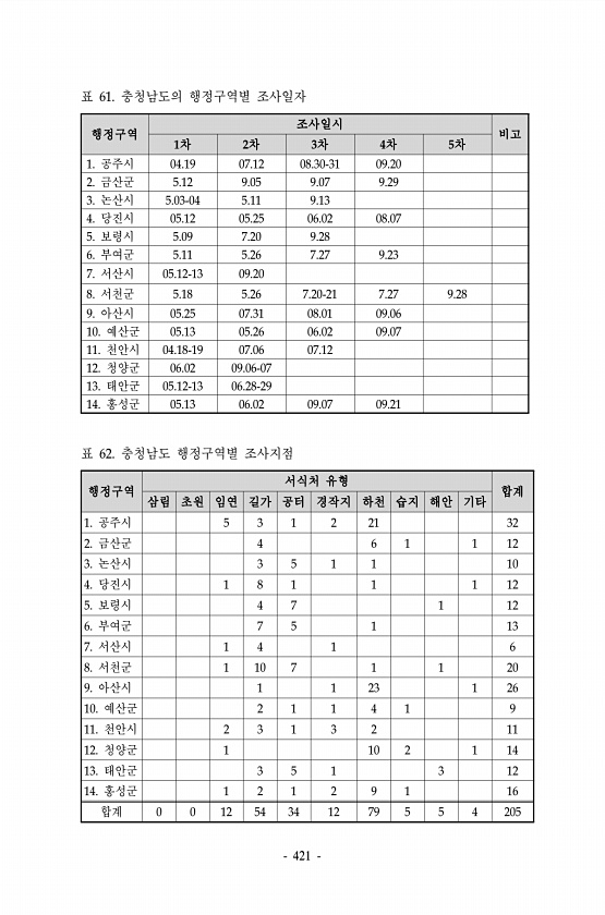 421 행정구역 조사일시 비고 1차 2차 3차 4차 5차 1. 공주시 04.19 07.12 08.30-31 09.20 2. 금산군 5.12 9.05 9.07 9.29 3. 논산시 5.03-04 5.11 9.13 4. 당진시 05.12 05.25 06.02 08.07 5. 보령시 5.09 7.20 9.28 6. 부여군 5.11 5.26 7.27 9.23 7. 서산시 05.12-13 09.20 8. 서천군 5.18 5.26 7.20-21 7.27 9.28 9. 아산시 05.25 07.31 08.01 09.06 10. 예산군 05.13 05.26 06.02 09.07 11. 천안시 04.18-19 07.06 07.12 12. 청양군 06.02 09.06-07 13. 태안군 05.12-13 06.28-29 14. ...