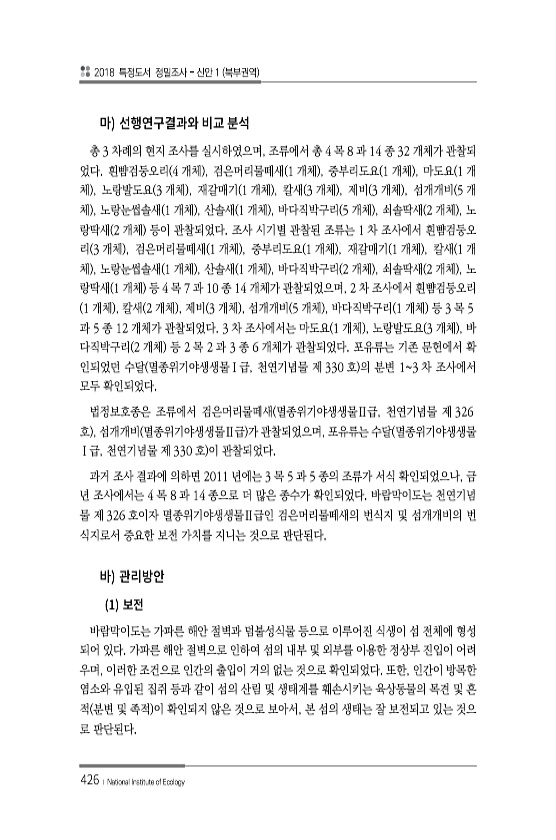 2018 특정도서 정밀조사 신안 1 북부권역 426 ? National Institute of Ecology 총 3 차례의 현지 조사를 실시하였으며, 조류에서 총 4 목 8 과 14 종 32 개체가 관찰되 었다. 흰뺨검둥오리 4 개체 , 검은머리물떼새 1 개체 , 중부리도요 1 개체 , 마도요 1 개 체 , 노랑발도요 3 개체 , 재갈매기 1 개체 , 칼새 3 개체 , 제비 3 개체 , 섬개개비 5 개 체 , 노랑눈썹솔새 1 개체 , 산솔새 1 개체 , 바다직박구리 5 개체 , 쇠솔딱새 2 개체 , 노 랑딱새 2 개체 등이 관찰되었다. 조사 시기별 관찰된 조류는 1 차 조사에서 흰뺨검둥오 리 3 개체 , 검은머리물떼새 1 개체 , 중부리도요 1 개체 , 재갈매기 1 개체 , 칼새 1 개 체 , 노랑눈썹솔새 ...