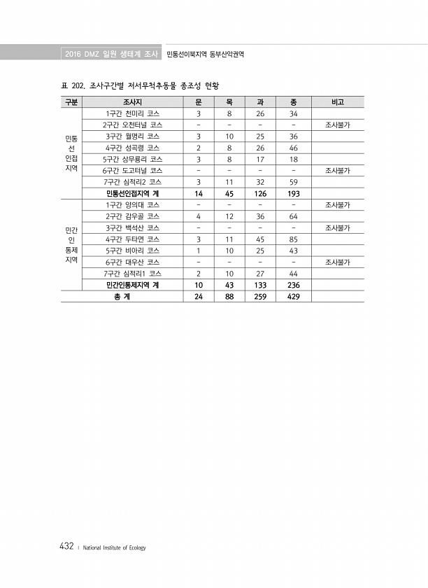 2016 DMZ 일원 생태계 조사 민통선이북지역 동부산악권역 432 ? National Institute of Ecology 구분 조사지 문 목 과 종 비고 민통 선 인접 지역 1구간 천미리 코스 3 8 26 34 2구간 오천터널 코스 조사불가 3구간 월명리 코스 3 10 25 36 4구간 성곡령 코스 2 8 26 46 5구간 상무룡리 코스 3 8 17 18 6구간 도고터널 코스 조사불가 7구간 심적리2 코스 3 11 32 59 민통선인접지역 계 14 45 126 193 민간 인 통제 지역 1구간 양의대 코스 조사불가 2구간 감우골 코스 4 12 36 64 3구간 백석산 코스 조사불가 4구간 두타연 코스 3 11 45 85 5구간 비아리 코스 1 10 25 43 6구간 대우산 코스 조사불가 7구간 심적리1 ...