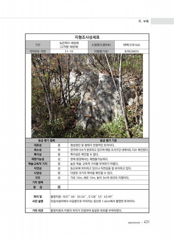 Ⅲ. 부록 www.nie.re.kr ? 431 지형조사상세표 구간 늦은목이화방재 고직령-화방재 도엽명 도엽번호 태백 378164 격자번호-연번 E1-10 지형명 기호 토어 GM05 등급 평가 항목 등급 평가 기준 대표성 중 형성원인 및 형태가 전형적인 토어이다. 희소성 하 전국에 다수가 분포하고 있으며 해당 조사구간 내에서도 다수 확인된다. 특이성 중 특이성은 확인할 수 없다. 재현가능성 상 현재 환경에서는 재현불가능하다. 학술?교육적 가치 중 높은 학술·교육적 가치를 부여하기 어렵다. 자연성 상 등산로에 위치하고 있으나 자연성을 잘 유지하고 있다. 다양성 중 다양한 크기의 핵석을 확인할 수 있다. 규모 상 가로 10m, 세로 10m, 높이 3m의 대규모 지형이다. 기타 항목 등 급 Ⅲ 위치 및 사진 설명 ...