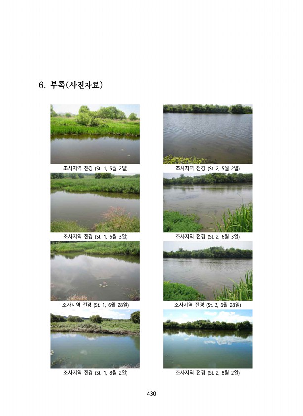430 6. 부록 사진자료 조사지역 전경 St. 1, 5월 2일 조사지역 전경 St. 2, 5월 2일 조사지역 전경 St. 1, 6월 3일 조사지역 전경 St. 2, 6월 3일 조사지역 전경 St. 1, 6월 28일 조사지역 전경 St. 2, 6월 28일 조사지역 전경 St. 1, 8월 2일 조사지역 전경 St. 2, 8월 2일