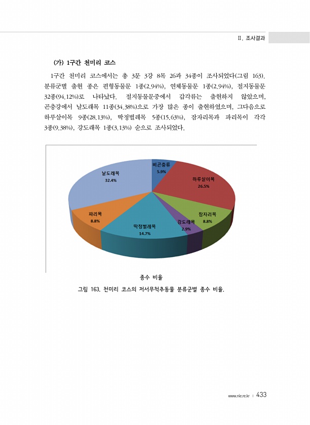 Ⅱ. 조사결과 www.nie.re.kr ? 433 가 1구간 천미리 코스 1구간 천미리 코스에서는 총 3문 3강 8목 26과 34종이 조사되었다 그림 163 분류군별 출현 종은 편형동물문 1종 2.94% , 연체동물문 1종 2.94% , 절지동물문 32종 94.12% 로 나타났다. 절지동물문중에서 갑각류는 출현하지 않았으며, 곤충강에서 날도래목 11종 34.38% 으로 가장 많은 종이 출현하였으며, 그다음으로 하루살이목 9종 28.13% , 딱정벌레목 5종 15.63% , 잠자리목과 파리목이 각각 3종 9.38% , 강도래목 1종 3.13% 순으로 조사되었다. 종수 비율 그림 163. 천미리 코스의 저서무척추동물 분류군별 종수비율.