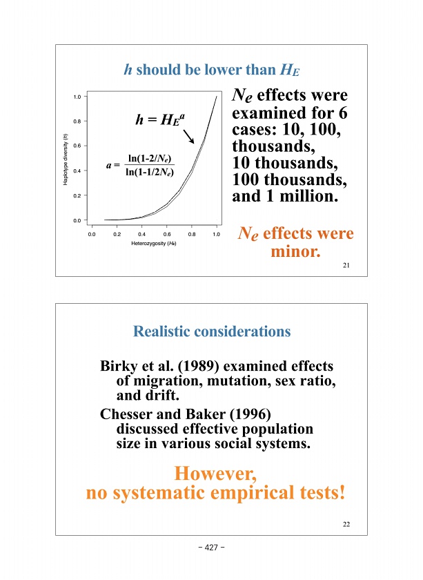 Realistic considerations Birky et al. 1989 examined effects of migration, mutation, sex ratio, and drift. Chesser and Baker 1996 discussed effective population size in various social systems. However, no systematic empirical tests! 22 h should be lower than HE a = ln 1-2/Ne ln 1-1/2Ne 0.0 0.2 0.4 0.6 0.8 1.0 0.0 0.2 0.4 0.6 0.8 1.0 Heterozygosity HE Haplotype diversity h Ne effects were examined f...