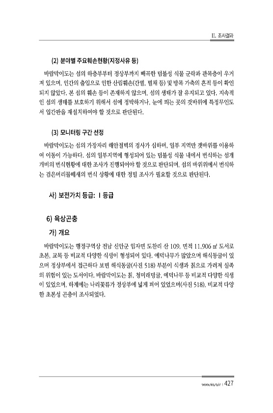II. 조사결과 www.nie.re.kr ?427 2 바람막이도는 섬의 하층부부터 정상부까지 빼곡한 덤불성 식물 군락과 관목층이 우거 져 있으며, 인간의 출입으로 인한 산림훼손 간벌, 벌채 등 및 방목 가축의 흔적 등이 확인 되지 않았다. 본 섬의 훼손 등이 존재하지 않으며, 섬의 생태가 잘 유지되고 있다. 지속적 인 섬의 생태를 보호하기 위해서 섬에 정박하거나, 눈에 띄는 곳의 갯바위에 특정무인도 서 입간판을 재설치하여야 할 것으로 판단된다. 3 바람막이도는 섬의 가장자리 해안절벽의 경사가 심하며, 일부 지역만 갯바위를 이용하 여 이동이 가능하다. 섬의 일부지역에 형성되어 있는 덤불성 식물 내에서 번식하는 섬개 개비의 번식현황에 대한 조사가 진행되어야 할 것으로 판단되며, 섬의 바위위에서 번식하 는 검은머...