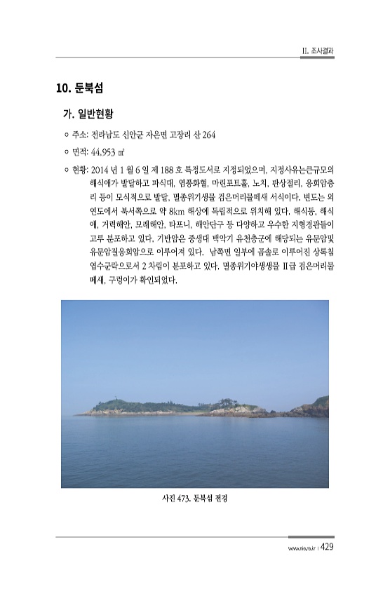 II. 조사결과 www.nie.re.kr ?429 10. ? 주소전라남도 신안군 자은면 고장리 산 264 ? 면적44,953 ㎡ ? 현황2014 년 1 월 6 일 제 188 호 특정도서로 지정되었으며, 지정사유는큰규모의 해식애가 발달하고 파식대, 염풍화혈, 마린포트홀, 노치, 판상절리, 응회암층 리 등이 모식적으로 발달, 멸종위기생물 검은머리물떼새 서식이다. 변도는 외 연도에서 북서쪽으로 약 8km 해상에 독립적으로 위치해 있다. 해식동, 해식 애, 거력해안, 모래해안, 타포니, 해안단구 등 다양하고 우수한 지형경관들이 고루 분포하고 있다. 기반암은 중생대 백악기 유천층군에 해당되는 유문암및 유문암질응회암으로 이루어져 있다. 남쪽면 일부에 곰솔로 이루어진 상록침 엽수군락으로서 2 차림이 분포하고 있다. 멸종...