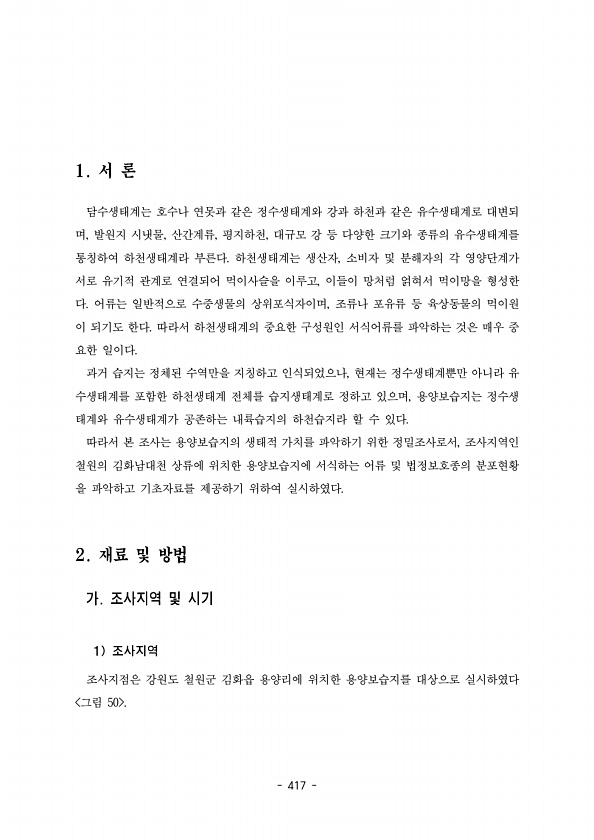 417 담수생태계는 호수나 연못과 같은 정수생태계와 강과 하천과 같은 유수생태계로 대변되 며 발원지 시냇물 산간계류 평지하천 대규모 강 등 다양한 크기와 종류의 유수생태계를 , , , , 통칭하여 하천생태계라 부른다 하천생태계는 생산자 소비자 및 분해자의 각 영양단계가 , 서로 유기적 관계로 연결되어 먹이사슬을 이루고 이들이 망처럼 얽혀서 먹이망을 형성한 , 다 어류는 일반적으로 수중생물의 상위포식자이며 조류나 포유류 등 육상동물의 먹이원 , 이 되기도 한다 따라서 하천생태계의 중요한 구성원인 서식어류를 파악하는 것은 매우 중 요한 일이다. 과거 습지는 정체된 수역만을 지칭하고 인식되었으나 현재는 정수생태계뿐만 아니라 유 , 수생태계를 포함한 하천생태계 전체를 습지생태계로 정하고 있으며 용양보습지는 정수생 ...