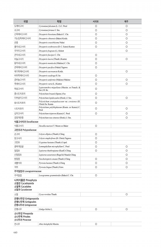 440 도깨비고비 Cyrtomium falcatum L. f. C. Presl ○ ○ 쇠고비 Cyrtomium fortunei J. Sm. ○ ○ 산족제비고사리 Dryopteris bissetiana Baker C. Chr. ○ ○ 가는잎족제비고사리 Dryopteris chinensis Baker Koidz. ○ ○ 관중 Dryopteris crassirhizoma Nakai ○ ○ 홍지네고사리 Dryopteris erythrosora D. C. Eaton Kuntze ○ ○ 주저리고사리 Dryopteris fragrans L. Schott ○ 큰지네고사리 Dryopteris fuscipes C. Chr. ○ 비늘고사리 Dryopteris lacera Thunb. Kuntze ○ ○ 왕지네고사리 Dryopt...