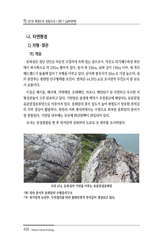 2018 특정도서 정밀조사 신안 1 남부권역 430 ? National Institute of Ecology 1 · 둔북섬은 전남 신안군 자은면 고장리에 속해 있는 섬으로서, 자은도 외기해수욕장 북단 에서 북서쪽으로 약 250m 떨어져 있다. 동서 폭 530m, 남북 길이 150m 이며, 세 개의 헤드랜드가 돌출해 있어 T 자형을 이루고 있다. 남서쪽 봉우리가 30m 로 가장 높으며, 섬 의 중앙부는 평탄한 단구형태를 보인다. 면적은 44,953 ㎡로 조사권역 무인도서 중 규모 가 보통이다. 이곳은 해식동, 해식애, 거력해안, 모래해안, 타포니, 해안단구 등 다양하고 우수한 지 형경관들이 고루 분포하고 있다. 기반암은 중생대 백악기 유천층군에 해당되는 유문암및 유문암질응회암으로 이루어져 있다. 응회암의 층리...