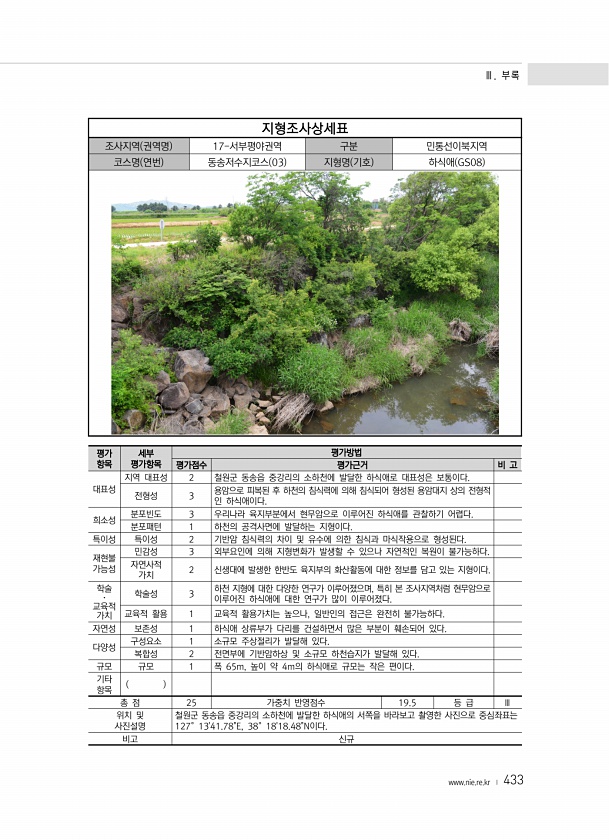 Ⅲ. 부록 www.nie.re.kr ? 433 지형조사상세표 조사지역 권역명 17-서부평야권역 구분 민통선이북지역 코스명 연번 동송저수지코스 03 지형명 기호 하식애 GS08 평가 항목 세부 평가항목 평가방법 평가점수 평가근거 비 고 대표성 지역 대표성 2 철원군 동송읍 중강리의 소하천에 발달한 하식애로 대표성은 보통이다. 전형성 3 용암으로 피복된 후 하천의 침식력에 의해 침식되어 형성된 용암대지 상의 전형적 인 하식애이다. 희소성 분포빈도 3 우리나라 육지부분에서 현무암으로 이루어진 하식애를 관찰하기 어렵다. 분포패턴 1 하천의 공격사면에 발달하는 지형이다. 특이성 특이성 2 기반암 침식력의 차이 및 유수에 의한 침식과 마식작용으로 형성된다. 재현불 가능성 민감성 3 외부요인에 의해 지형변화가 발생할 수...