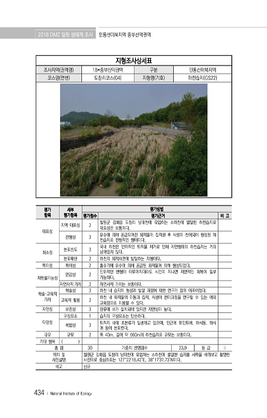 2018 DMZ 일원 생태계 조사 민통선이북지역 중부산악권역 434 ? National Institute of Ecology 지형조사상세표 조사지역 권역명 18-중부산악권역 구분 민통선이북지역 코스명 연번 도창리코스 04 지형명 기호 하천습지 GS22 평가 항목 세부 평가항목 평가방법 평가점수 평가근거 비 고 대표성 지역 대표성 2 철원군 김화읍 도창리 남대천에 유입하는 소하천에 발달한 하천습지로 대표성은 보통이다. 전형성 3 유수에 의해 공급되어진 퇴적물이 집적된 후 식생이 천이되어 형성된 하 천습지로 전형적인 형태이다. 희소성 분포빈도 3 국내 하천은 인위적인 퇴적물 제거로 인해 자연형태의 하천습지는 거의 남아있지 않다. 분포패턴 2 하천의 퇴적사면에 발달하는 지형이다. 특이성 특이성 2 홍수기에 유수에...