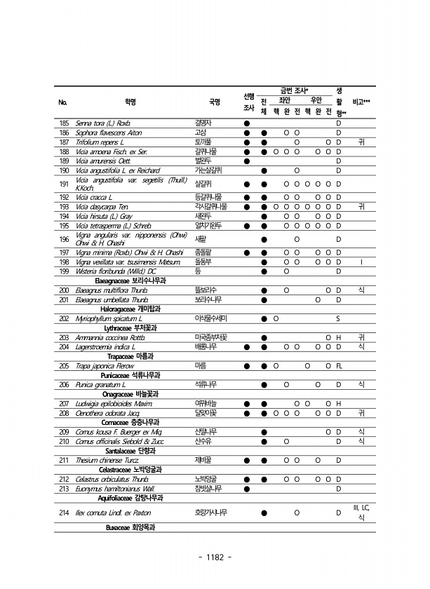 1182 No. 학명 국명 선행 조사 금번 조사* 생 활 형 ** 전 비고*** 체 좌안 우안 핵 완 전 핵 완 전 185 Senna tora L. Roxb. 결명자 ● D 186 Sophora flavescens Aiton 고삼 ● ● O O D 187 Trifolium repens L. 토끼풀 ● ● O O D 귀 188 Vicia amoena Fisch. ex Ser. 갈퀴나물 ● ● O O O O O D 189 Vicia amurensis Oett. 벌완두 ● D 190 Vicia angustifolia L. ex Reichard 가는살갈퀴 ● O D 191 Vicia angustifolia var. segetilis Thuill. K.Koch. 살갈퀴 ● ● O O O O O D 192 Vicia ...
