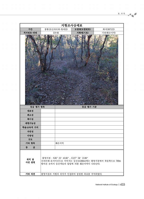 Ⅲ. 부 록 National Institute of EcologyⅠ433 지형조사상세표 구간 봉황산 신의터재-형제봉 도엽명 도엽번호 화서 367122 격자번호-연번 E9-06 지형명 기호 기타 훼손지역 등급 평가 항목 등급 평가 기준 대표성 희소성 특이성 재현가능성 학술?교육적 가치 자연성 다양성 규모 기타 항목 훼손지역 등 급 위치 및 사진 설명 촬영지점 N36° 23′ 43.66″ , E127° 58′ 13.90″ 신의터재-윤지미산으로 이어지는 등산로 200m 에는 촬영지점에서 북동쪽으로 700m 떨어진 곳까지 등산객들의 답압에 의한 훼손지역이 나타난다. 기타 의견 촬영지점과 지형의 위치가 인접하여 동일한 좌표를부여하였다.