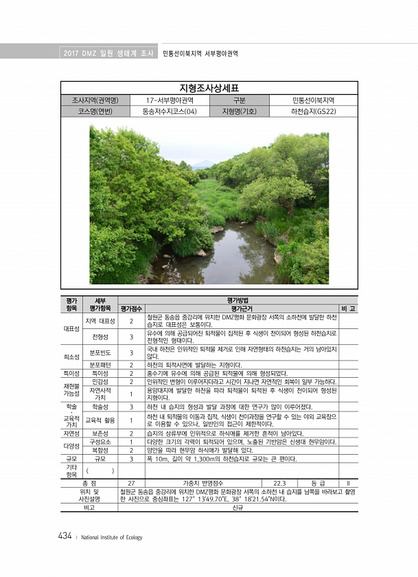 2017 DMZ 일원 생태계 조사 민통선이북지역 서부평야권역 434 ? National Institute of Ecology 지형조사상세표 조사지역 권역명 17-서부평야권역 구분 민통선이북지역 코스명 연번 동송저수지코스 04 지형명 기호 하천습지 GS22 평가 항목 세부 평가항목 평가방법 평가점수 평가근거 비 고 대표성 지역 대표성 2 철원군 동송읍 중강리에 위치한 DMZ평화 문화광장 서쪽의 소하천에 발달한 하천 습지로 대표성은 보통이다. 전형성 3 유수에 의해 공급되어진 퇴적물이 집적된 후 식생이 천이되어 형성된 하천습지로 전형적인 형태이다. 희소성 분포빈도 3 국내 하천은 인위적인 퇴적물 제거로 인해 자연형태의 하천습지는 거의 남아있지 않다. 분포패턴 2 하천의 퇴적사면에 발달하는 지형이다. 특이성 특이...