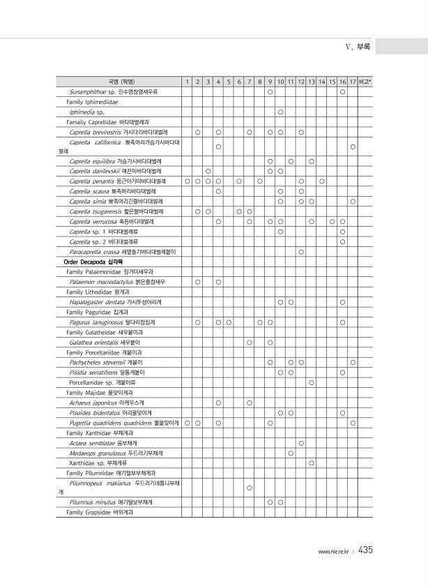 Ⅴ. 부록 www.nie.re.kr ? 435 국명 학명 1 2 3 4 5 6 7 8 9 10 11 12 13 14 15 16 17 비고* Sunamphithoe sp. 민수염참옆새우류 ○ ○ Family Iphimediidae Iphimedia sp. ○ Famaily Caprellidae 바다대벌레과 Caprella brevirostris 가시다리바다대벌레 ○ ○ ○ ○ ○ ○ Caprella californica 뾰족머리가슴가시바다대 벌레 ○ ○ Caprella equilibra 가슴가시바다대벌레 ○ ○ ○ Caprella danilevskii 매끈이바다대벌레 ○ ○ ○ Caprella penantis 둥근아가미바다대벌레 ○ ○ ○ ○ ○ ○ ○ ○ Caprella scaura 뾰족머리바다대벌레 ○ ○...