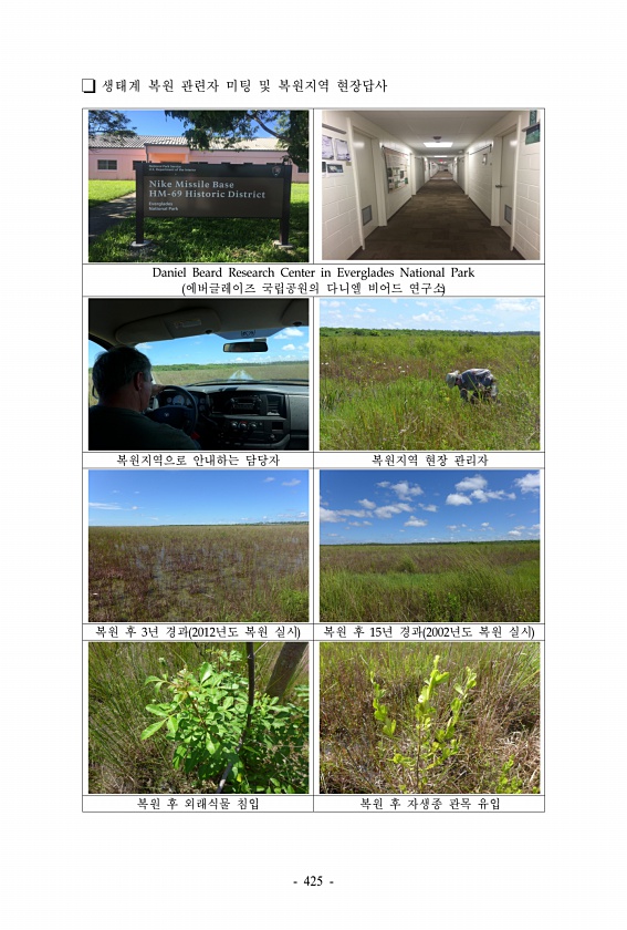 생태계 복원 관련자 미팅 및 복원지역 현장답사 Daniel Beard Research Center in Everglades National Park 에버글레이즈 국립공원의 다니엘 비어드 연구소 복원지역으로 안내하는 담당자 복원지역 현장 관리자 복원 후 3년 경과 2012년도 복원 실시 복원 후 15년 경과 2002년도 복원 실시 복원 후 외래식물 침입 복원 후 자생종 관목 유입 425