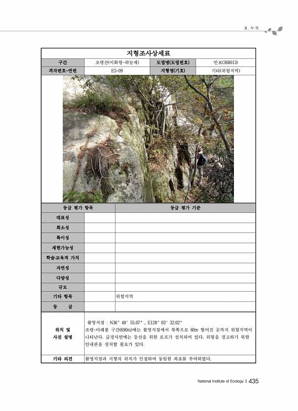 Ⅲ. 부 록 National Institute of EcologyⅠ435 지형조사상세표 구간 조령산 이화령-하늘재 도엽명 도엽번호 안보 368013 격자번호-연번 E5-09 지형명 기호 기타 위험지역 등급 평가 항목 등급 평가 기준 대표성 희소성 특이성 재현가능성 학술?교육적 가치 자연성 다양성 규모 기타 항목 위험지역 등 급 위치 및 사진 설명 촬영지점 N36° 48′ 55.07″ , E128° 03′ 32.02″ 조령마패봉 구간 690m 에는 촬영지점에서 북쪽으로 60m 떨어진 곳까지 위험지역이 나타난다. 급경사면에는 등산을 위한 로프가 설치되어 있다. 위험을 경고하기 위한 안내판을 설치할 필요가 있다. 기타 의견 촬영지점과 지형의 위치가 인접하여 동일한 좌표를부여하였다.