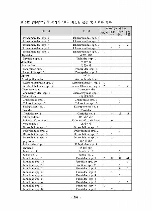 398 학 명 국 명 조사지점/ 개체수 천왕사 1100 고지 사제비 동산 윗세 오름 Ichneumonidae spp. 5 Ichneumonidae spp. 5 1 Ichneumonidae spp. 6 Ichneumonidae spp. 6 1 Ichneumonidae spp. 7 Ichneumonidae spp. 7 3 2 Ichneumonidae spp. 8 Ichneumonidae spp. 8 1 1 Ichneumonidae spp. 9 Ichneumonidae spp. 9 1 1 Tiphiidae 굼벵이벌과 Tiphiidae spp. 1 Tiphiidae spp. 1 1 Mecoptera 밑들이목 Panorpidae 밑들이과 Panorpidae spp. 1 Panorpidae spp. 1 1 Panorp...