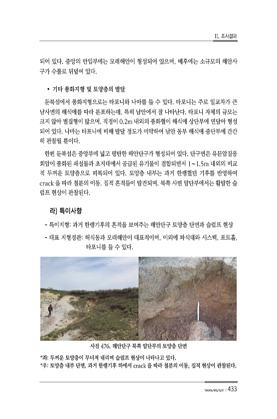 II. 조사결과 www.nie.re.kr ?433 되어 있다. 중앙의 만입부에는 모래해안이 형성되어 있으며, 배후에는 소규모의 해안사 구가 수풀로 뒤덮여 있다. ? 기타 풍화지형 및 토양층의 발달 둔북섬에서 풍화지형으로는 타포니와 나마를 들 수 있다. 타포니는 주로 일교차가 큰 남사면의 해식애를 따라 분포하는데, 특히 남안에서 잘 나타난다. 타포니 자체의 규모는 크지 않아 벌집형이 많으며, 직경이 0.2m 내외의 풍화혈이 해식애 상단부에 연달아 형성 되어 있다. 나마는 타포니에 비해 발달 정도가 미약하여 남안 동부 해식애 중단부에 간간 히 관찰될 뿐이다. 한편 둔북섬은 중앙부에 넓고 평탄한 해안단구가 형성되어 있다. 단구면은 유문암질응 회암이 풍화된 쇄설물과 초지대에서 공급된 유기물이 결합되면서 1∼1.5m...