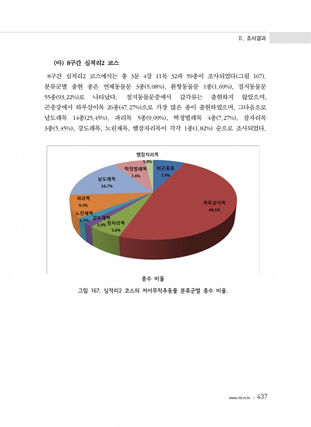 Ⅱ. 조사결과 www.nie.re.kr ? 437 마 8구간 심적리2 코스 8구간 심적리2 코스에서는 총 3문 4강 11목 32과 59종이 조사되었다 그림 167 분류군별 출현 종은 연체동물문 3종 5.08% , 환형동물문 1종 1.69% , 절지동물문 55종 93.22% 로 나타났다. 절지동물문중에서 갑각류는 출현하지 않았으며, 곤충강에서 하루살이목 26종 47.27% 으로 가장 많은 종이 출현하였으며, 그다음으로 날도래목 14종 25.45% , 파리목 5종 9.09% , 딱정벌레목 4종 7.27% , 잠자리목 3종 5.45% , 강도래목, 노린재목, 뱀잠자리목이 각각 1종 1.82% 순으로 조사되었다. 종수 비율 그림 167. 심적리2 코스의 저서무척추동물 분류군별 종수비율.