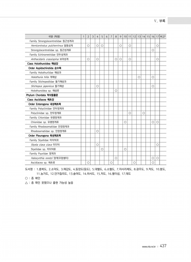 Ⅴ. 부록 www.nie.re.kr ? 437 국명 학명 1 2 3 4 5 6 7 8 9 10 11 12 13 14 15 16 17 비고* Family Strongylocentrotidae 둥근성게과 Hemicentrotus pulcherrimus 말똥성게 ○ ○ ○ ○ ○ ○ Strongylocentrotidae sp. 둥근성게류 ○ Family Echinometridae 만두성게과 Anthocidaris crassispina 보라성게 ○ ○ ○ ○ ○ ○ Class Holothuroidea 해삼강 Order Aspidochirotida 순수목 Family Holothuriidae 해삼과 Holothuria hilla 개해삼 ○ ○ Family Stichopodidae 돌기해삼과 Stichopus japo...