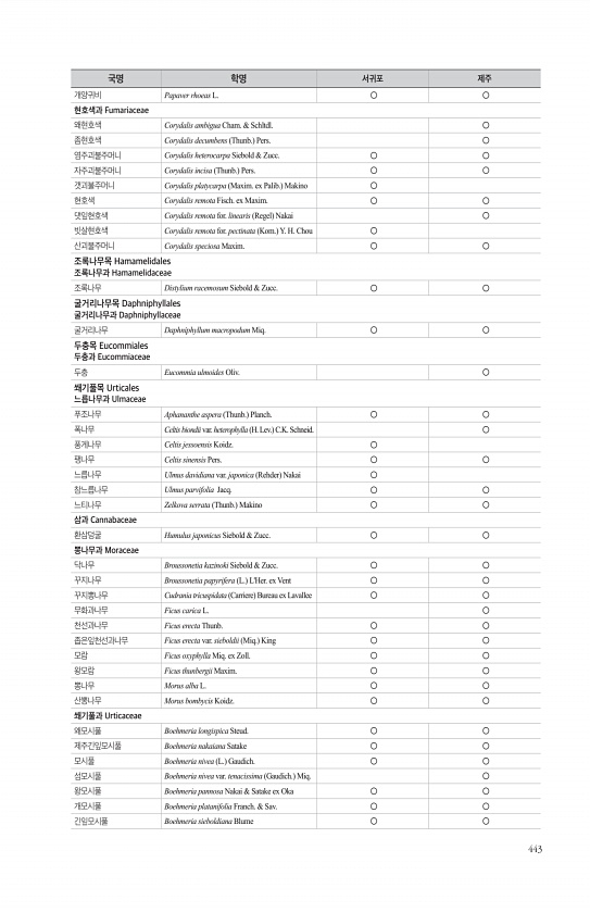 443 개양귀비 Papaver rhoeas L. ○ ○ 현호색과 Fumariaceae 왜현호색 Corydalis ambigua Cham. & Schltdl. ○ 좀현호색 Corydalis decumbens Thunb. Pers. ○ 염주괴불주머니 Corydalis heterocarpa Siebold & Zucc. ○ ○ 자주괴불주머니 Corydalis incisa Thunb. Pers. ○ ○ 갯괴불주머니 Corydalis platycarpa Maxim. ex Palib. Makino ○ 현호색 Corydalis remota Fisch. ex Maxim. ○ ○ 댓잎현호색 Corydalis remota for. linearis Regel Nakai ○ 빗살현호색 Corydalis remota for. pec...
