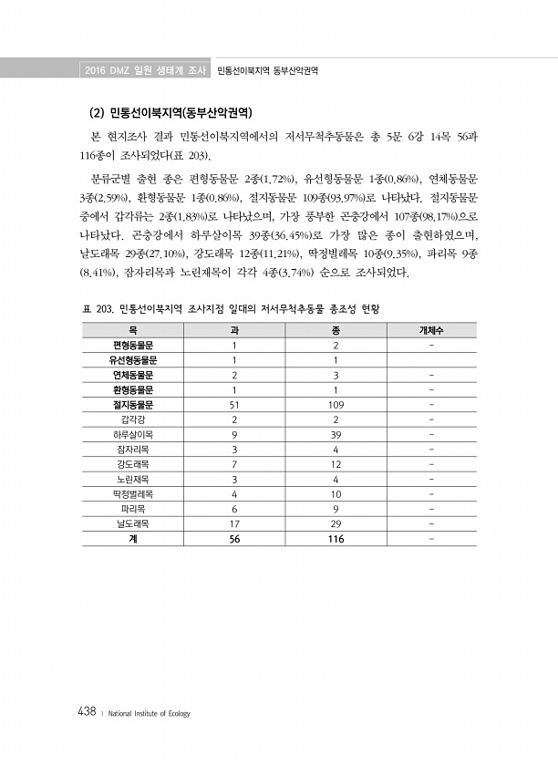 2016 DMZ 일원 생태계 조사 민통선이북지역 동부산악권역 438 ? National Institute of Ecology 2 민통선이북지역 동부산악권역 본 현지조사 결과 민통선이북지역에서의 저서무척추동물은 총 5문 6강 14목 56과 116종이 조사되었다 표 203 분류군별 출현 종은 편형동물문 2종 1.72% , 유선형동물문 1종 0.86% , 연체동물문 3종 2.59% , 환형동물문 1종 0.86% , 절지동물문 109종 93.97% 로 나타났다. 절지동물문 중에서 갑각류는 2종 1.83% 로 나타났으며, 가장 풍부한 곤충강에서 107종 98.17% 으로 나타났다. 곤충강에서 하루살이목 39종 36.45% 로 가장 많은 종이 출현하였으며, 날도래목 29종 27.10% , 강도래목 12종 11.21% ...