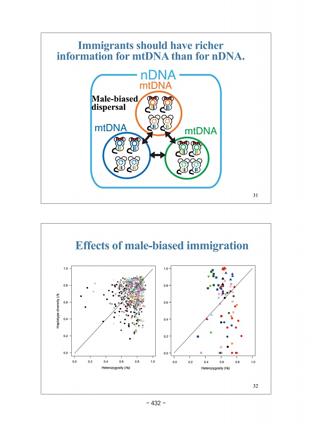 Effects of male-biased immigration Heterozygosity HE 0.0 0.2 0.4 0.6 0.8 1.0 0.0 0.2 0.4 0.6 0.8 1.0 Heterozygosity HE Haplotype diversity h 0.0 0.2 0.4 0.6 0.8 1.0 0.0 0.2 0.4 0.6 0.8 1.0 32 nDNA mtDNA mtDNA mtDNA Male-biased dispersal Immigrants should have richer information for mtDNA than for nDNA. 31 432