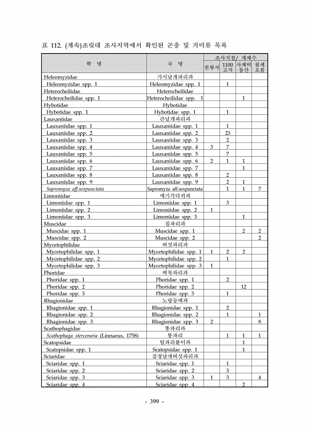 399 학 명 국 명 조사지점/ 개체수 천왕사 1100 고지 사제비 동산 윗세 오름 Heleomyzidae 가시날개파리과 Heleomyzidae spp. 1 Heleomyzidae spp. 1 1 Heterocheilidae Heterocheilidae Heterocheilidae spp. 1 Heterocheilidae spp. 1 1 Hybotidae Hybotidae Hybotidae spp. 1 Hybotidae spp. 1 1 Lauxaniidae 큰날개파리과 Lauxaniidae spp. 1 Lauxaniidae spp. 1 1 Lauxaniidae spp. 2 Lauxaniidae spp. 2 23 Lauxaniidae spp. 3 Lauxaniidae spp. 3 2 Lauxaniidae sp...
