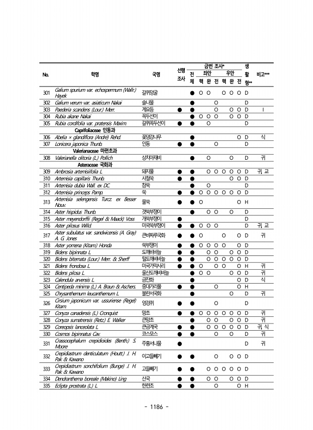 1186 No. 학명 국명 선행 조사 금번 조사* 생 활 형 ** 전 비고*** 체 좌안 우안 핵 완 전 핵 완 전 301 Galium spurium var. echospermum Wallr. Hayek 갈퀴덩굴 ● O O O O O D 302 Galium verum var. asiaticum Nakai 솔나물 ● O D 303 Paederia scandens Lour. Merr. 계요등 ● ● O O O D I 304 Rubia akane Nakai 꼭두선이 ● O O O O O D 305 Rubia cordifolia var. pratensis Maxim. 갈퀴꼭두선이 ● ● O D Caprifoliaceae 인동과 306 Abelia × glandiflora Andr? Rehd. 꽃댕강나무 ● O D ...