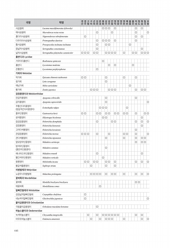 446 사슴벌레 Lucanus maculifemoratus dybowskyi ○ ○ ○ ○ ○ ○ 애사슴벌레 Macrodorcas rectus rectus ○ ○ ○ ○ 홍다리사슴벌레 Nipponodorcus rubrofemoratus ○ ○ ○ 다우리아사슴벌레 Prismognathus dauricus ○ ○ ○ ○ ○ ○ 톱사슴벌레 Prosopocoilus inclinatus inclinatus ○ ○ ○ ○ 참넓적사슴벌레 Serrognathus consentaneus ○ ○ 넓적사슴벌레 Serrognathus platymelus castanicolor ○ ○ ○ ○ ○ ○ ○ ○ ○ ○ ○ ○ ○ ○ ○ 홍반디과 Lycidae 거무티티홍반디 Benibotarus spinicoxis ○ 홍반디 Lycost...