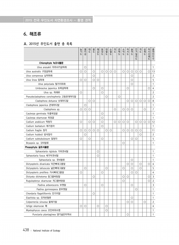 2015 전국 무인도서 자연환경조사 통영 권역 438 ? National Institute of Ecology 농가도 별이섬 태도 봉도 해갑도 동장도 대혈도 소혈도 저도 춘복도 소덕도 하서도 솔여도 안거칠리도 적도 삼례도 좌사리제도 출현빈도수 Chlorophyte 녹조식물문 Ulva arasakii 아라사키갈파래 ○ 1 Ulva australis 구멍갈파래 ○ ○ ○ ○ ○ ○ ○ ○ ○ ○ ○ ○ ○ 13 Ulva compressa 납작파래 ○ ○ 2 Ulva linza 잎파래 ○ ○ ○ ○ ○ 5 Ulva polyclada 털가지파래 ○ 1 Umbraulva japonica 초록갈파래 ○ ○ ○ ○ 4 Ulva sp. 파래류 ○ ○ 2 Pseudocladophora conchopheria 고둥옷대마디말 ...