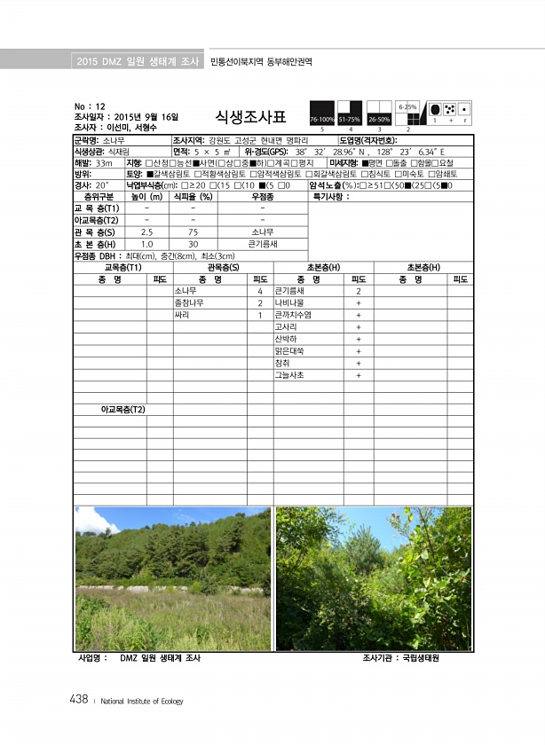 2015 DMZ 일원 생태계 조사 민통선이북지역 동부해안권역 438 ? National Institute of Ecology No 12 조사일자 2015년 9월 16일 조사자 이선미, 서형수 식생조사표 군락명소나무 조사지역강원도 고성군 현내면 명파리 도엽명 격자번호 식생상관식재림 면적5 × 5 ㎡ 위·경도 GPS 38° 32′ 28.96″N , 128° 23′ 6.34″E 해발33m 지형□산정□능선■사면 □상□중■하 □계곡□평지 미세지형■평면 □돌출 □함몰□요철 방위토양■갈색삼림토 □적황색삼림토 □암적색삼림토 □회갈색삼림토 □침식토 □미숙토 □암쇄토 경사20° 낙엽부식층 cm □≥20 □ 15 □ 10 ■ 5 □0 암석노출 % □≥51□ 50■ 25□ 5■0 층위구분 높이 m 식피율 % 우점종 특기사항 교 ...