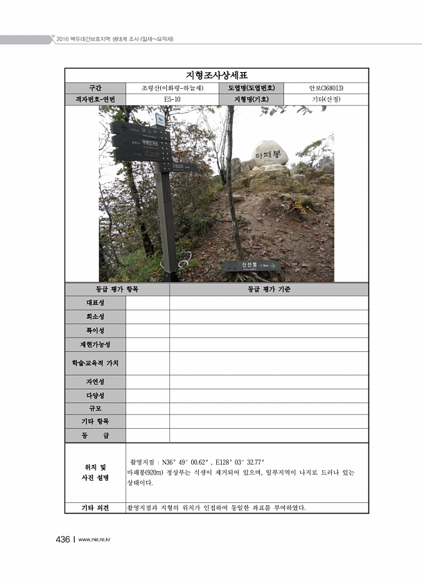 2016 백두대간보호지역 생태계 조사 밀재묘적재 436Ⅰwww.nie.re.kr 지형조사상세표 구간 조령산 이화령-하늘재 도엽명 도엽번호 안보 368013 격자번호-연번 E5-10 지형명 기호 기타 산정 등급 평가 항목 등급 평가 기준 대표성 희소성 특이성 재현가능성 학술?교육적 가치 자연성 다양성 규모 기타 항목 등 급 위치 및 사진 설명 촬영지점 N36° 49′ 00.62″ , E128° 03′ 32.77″ 마패봉 920m 정상부는 식생이 제거되어 있으며, 일부지역이 나지로 드러나 있는 상태이다. 기타 의견 촬영지점과 지형의 위치가 인접하여 동일한 좌표를부여하였다.