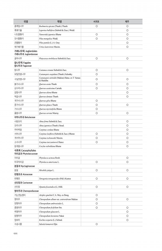 444 좀깨잎나무 Boehmeria spicata Thunb. Thunb. ○ ○ 혹쐐기풀 Laportea bulbifera Siebold & Zucc. Wedd. ○ 나도물통이 Nanocnide japonica Blume ○ ○ 모시물통이 Pilea mongolica Wedd. ○ ○ 큰물통이 Pilea pumila L. A. Gray ○ 애기쐐기풀 Urtica laetevirens Maxim. ○ 가래나무목 Juglandales 가래나무과 Juglandaceae 굴피나무 Platycarya strobilacea Siebold & Zucc. ○ ○ 참나무목 Fagales 참나무과 Fagaceae 밤나무 Castanea crenata Siebold & Zucc. ○ ○ 모밀잣밤나무 Castanopsis cu...