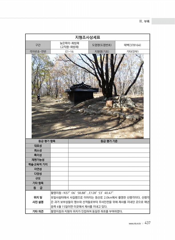 Ⅲ. 부록 www.nie.re.kr ? 437 지형조사상세표 구간 늦은목이화방재 고직령-화방재 도엽명 도엽번호 태백 378164 격자번호-연번 E1-16 지형명 기호 기타 안부 등급 평가 항목 등급 평가 기준 대표성 희소성 특이성 재현가능성 학술?교육적 가치 자연성 다양성 규모 기타 항목 등 급 위치 및 사진 설명 촬영지점 N37°06′58.88″, E128°53′40.47″ 유일사쉼터에서 사길령으로 이어지는 등산로 2.0km에서 촬영한 산령각이다. 산령각 은 과거 보부상들이 맹수와 산적들로부터 무사안전을 위해 제사를 지내던 곳으로 매년 음력 4월 15일이면 이곳에서 제사를 지내고 있다. 기타 의견 촬영지점과 지형의 위치가 인접하여 동일한 좌표를부여하였다.