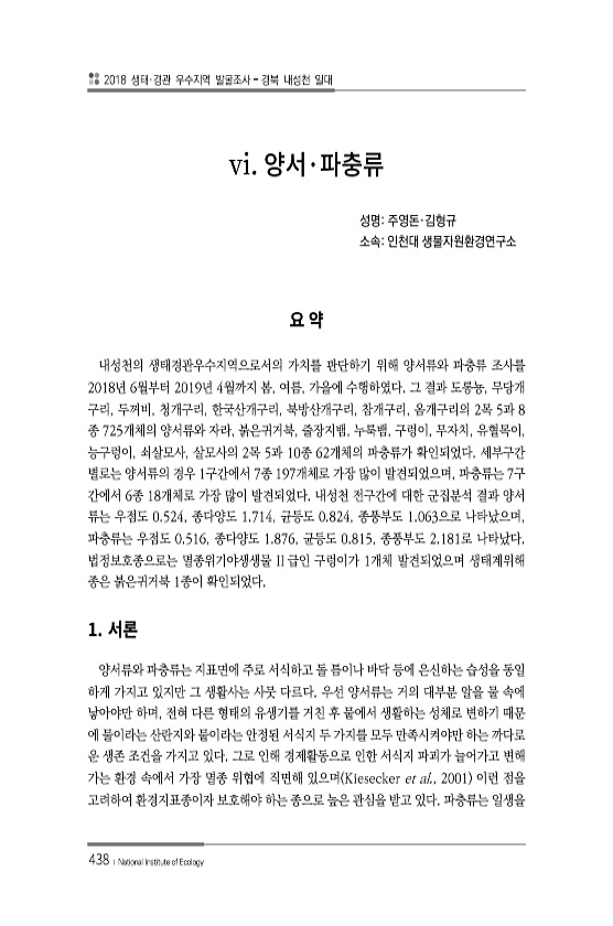 2018 생태·경관 우수지역 발굴조사 경북 내성천 일대 438 ? National Institute of Ecology vi. · 성명주영돈·김형규 소속인천대 생물자원환경연구소 내성천의 생태경관우수지역으로서의 가치를 판단하기 위해 양서류와 파충류 조사를 2018년 6월부터 2019년 4월까지 봄, 여름, 가을에 수행하였다. 그 결과 도롱뇽, 무당개 구리, 두꺼비, 청개구리, 한국산개구리, 북방산개구리, 참개구리, 옴개구리의 2목 5과 8 종 725개체의 양서류와 자라, 붉은귀거북, 줄장지뱀, 누룩뱀, 구렁이, 무자치, 유혈목이, 능구렁이, 쇠살모사, 살모사의 2목 5과 10종 62개체의 파충류가 확인되었다. 세부구간 별로는 양서류의 경우 1구간에서 7종 197개체로 가장 많이 발견되었으며, 파충류는 7구 간...