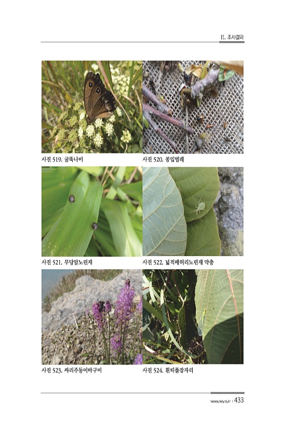 II. 조사결과 www.nie.re.kr ?433 사진 519. 굴뚝나비 사진 520. 콩잎벌레 사진 521. 무당알노린재 사진 522. 넓적배허리노린재 약충 사진 523. 싸리주둥이바구미 사진 524.흰띠풀잠자리
