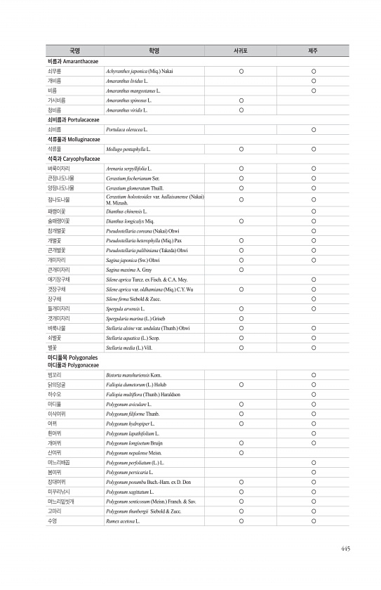 445 비름과 Amaranthaceae 쇠무릎 Achyranthes japonica Miq. Nakai ○ ○ 개비름 Amaranthus lividus L. ○ 비름 Amaranthus mangostanus L. ○ 가시비름 Amaranthus spinosus L. ○ 청비름 Amaranthus viridis L. ○ 쇠비름과 Portulacaceae 쇠비름 Portulaca oleracea L. ○ 석류풀과 Molluginaceae 석류풀 Mollugo pentaphylla L. ○ ○ 석죽과 Caryophyllaceae 벼룩이자리 Arenaria serpyllifolia L. ○ ○ 큰점나도나물 Cerastium fscherianum Ser. ○ ○ 양점나도나물 Cerastium glomeratum Th...