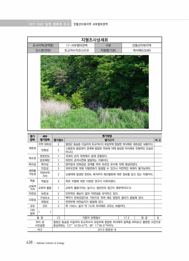 2017 DMZ 일원 생태계 조사 민통선이북지역 서부평야권역 438 ? National Institute of Ecology 지형조사상세표 조사지역 권역명 17-서부평야권역 구분 민통선이북지역 코스명 연번 토교저수지코스 03 지형명 기호 하식애 GS08 평가 항목 세부 평가항목 평가방법 평가점수 평가근거 비 고 대표성 지역 대표성 2 철원군 동송읍 이길리의 토교저수지 유입부에 발달한 하식애로 대표성은 보통이다. 전형성 2 스텝토와 용암대지 경계에 발달한 하천에 의해 형성된 하식애로 전형적인 모습은 아니다. 희소성 분포빈도 1 국내의 산지 하천에서 쉽게 관찰된다. 분포패턴 1 하천의 공격사면에 발달하는 지형이다. 특이성 특이성 2 현무암과 반화강암 경계를 따라 흐르던 유수에 의해 형성되었다. 재현불 가능성 민...