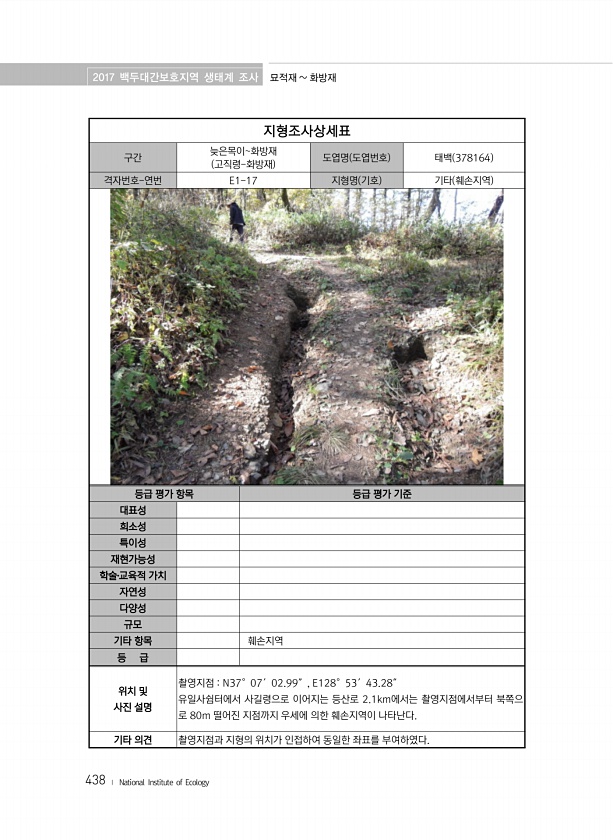2017 백두대간보호지역 생태계 조사 묘적재 화방재 438 ? National Institute of Ecology 지형조사상세표 구간 늦은목이화방재 고직령-화방재 도엽명 도엽번호 태백 378164 격자번호-연번 E1-17 지형명 기호 기타 훼손지역 등급 평가 항목 등급 평가 기준 대표성 희소성 특이성 재현가능성 학술?교육적 가치 자연성 다양성 규모 기타 항목 훼손지역 등 급 위치 및 사진 설명 촬영지점 N37°07′02.99″, E128°53′43.28″ 유일사쉼터에서 사길령으로 이어지는 등산로 2.1km에서는 촬영지점에서부터 북쪽으 로 80m 떨어진 지점까지 우세에 의한 훼손지역이 나타난다. 기타 의견 촬영지점과 지형의 위치가 인접하여 동일한 좌표를부여하였다.