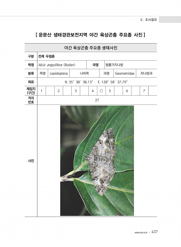 Ⅱ. 조사결과 www.nie.re.kr ? 437 [ 운문산 생태경관보전지역 야간 육상곤충 주요종 사진 ] 야간 육상곤충 주요종 생태사진 구분 전체 우점종 학명 Alcis angulifera Butler 국명 털뿔가지나방 분류 목명 Lepidoptera 나비목 과명 Geometridae 자나방과 좌표 N 35°38′38.13″ E 128°58′37.79″ 채집지 구간 1 2 3 4 ○ 5 6 7 격자 번호 27사진