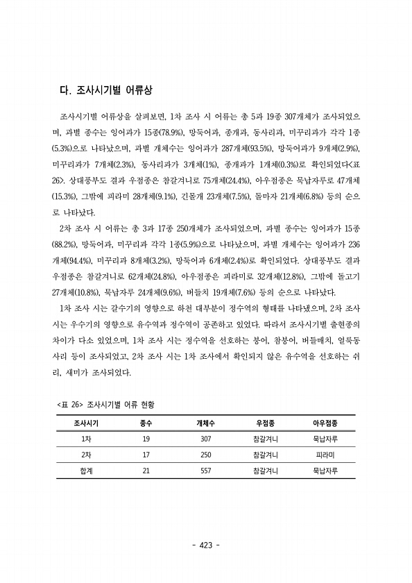 423 조사시기별 어류상을 살펴보면 차 조사 시 어류는 총 과 종 개체가 조사되었으 , 1 5 19 307 며 과별 종수는 잉어과가 종 망둑어과 종개과 동사리과 미꾸리과가 각각 종 , 15 78.9% , , , , 1 5.3% 으로 나타났으며 과별 개체수는 잉어과가 개체 망둑어과가 개체 , 287 93.5% , 9 2.9% , 미꾸리과가 개체 동사리과가 개체 종개과가 개체 로 확인되었다 표 7 2.3% , 3 1% , 1 0.3% 26 상대풍부도 결과 우점종은 참갈겨니로 개체 아우점종은 묵납자루로 개체 75 24.4% , 47 15.3% , 그밖에 피라미 개체 긴몰개 개체 돌마자 개체 등의 순으 28 9.1% , 23 7.5% , 21 6.8% 로 나타났다. 2차 조사 시 어류는 총 과 종 개체가 조사되었으...
