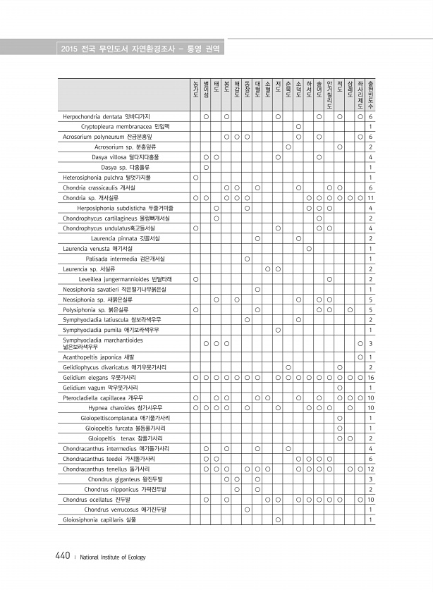 2015 전국 무인도서 자연환경조사 통영 권역 440 ? National Institute of Ecology 농가도 별이섬 태도 봉도 해갑도 동장도 대혈도 소혈도 저도 춘복도 소덕도 하서도 솔여도 안거칠리도 적도 삼례도 좌사리제도 출현빈도수 Herpochondria dentata 잇바디가지 ○ ○ ○ ○ ○ ○ 6 Cryptopleura membranacea 민잎맥 ○ 1 Acrosorium polyneurum 잔금분홍잎 ○ ○ ○ ○ ○ ○ 6 Acrosorium sp. 분홍잎류 ○ ○ 2 Dasya villosa 털다지다홍풀 ○ ○ ○ ○ 4 Dasya sp. 다홍풀류 ○ 1 Heterosiphonia pulchra 털엇가지풀 ○ 1 Chondria crassicaulis 개서실 ○ ○ ○ ○ ○ ○ ...