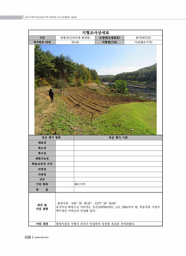 2016 백두대간보호지역 생태계 조사 추풍령밀재 438Ⅰwww.nie.re.kr 지형조사상세표 구간 봉황산 신의터재-형제봉 도엽명 도엽번호 화서 367122 격자번호-연번 E6-03 지형명 기호 기타 훼손지역 등급 평가 항목 등급 평가 기준 대표성 희소성 특이성 재현가능성 학술?교육적 가치 자연성 다양성 규모 기타 항목 훼손지역 등 급 위치 및 사진 설명 촬영지점 N36° 26′ 09.35″ , E127° 58′ 50.04″ 윤지미산-화령으로 이어지는 등산로 870m 에는 고도 320m까지 밭, 특용작물 시설이 백두대간 마룻금과 인접해 있다. 기타 의견 촬영지점과 지형의 위치가 인접하여 동일한 좌표를부여하였다.