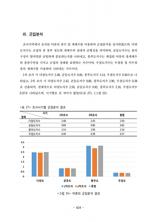 424 조사지역에서 조사된 어류의 종수 및 개체수를 이용하여 군집분석을 실시하였으며 다양, 도지수는 군집의 종 풍부 정도와 개체수의 상대적 균형성을 의미하며 균등도지수는 종의 , 구성이 얼마만큼 균일하게 분포하는지를 나타내고 풍부도지수는 채집된 어류의 총개체수 , 와 총종수만을 가지고 군집의 상태를 표현하는 지수이며 우점도지수는 우점종 및 아우점 , 종의 개체수를 이용하여 나타내는 지수이다. 1차 조사 시 다양도지수 균등도지수 풍부도지수 우점도지수 으로 나 2.48, 0.84, 3.14, 0.40 타났고 차 조사 시 다양도지수 균등도지수 풍부도지수 우점도지수 , 2 2.43, 0.86, 2.90, 0.38 로 산출되어 전체적으로 다양도지수 균등도지수 풍부도지수 우점도지수 , 2.50, 0.82, 3.16, ...