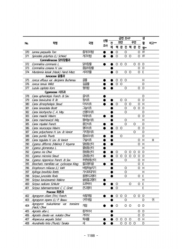 1188 No. 학명 국명 선행 조사 금번 조사* 생 활 형 ** 전 비고*** 체 좌안 우안 핵 완 전 핵 완 전 370 Lemna perpusilla Torr. 좀개구리밥 ● ● O O O FF 371 Spirodela polyrhiza L. Schleid. 개구리밥 ● ● O O O O FF Commelinaceae 닭의장풀과 372 Commelina communis L. 닭의장풀 ● ● O O O O O D 373 Commelina coreana H. Lev. 좀닭의장풀 ● O D 374 Murdannia keisak Hassk. Hand.-Mazz. 사마귀풀 ● O O O O E Juncaceae 골풀과 375 Juncus effusus var. decipiens Buchenau 골풀 ● ● O O...