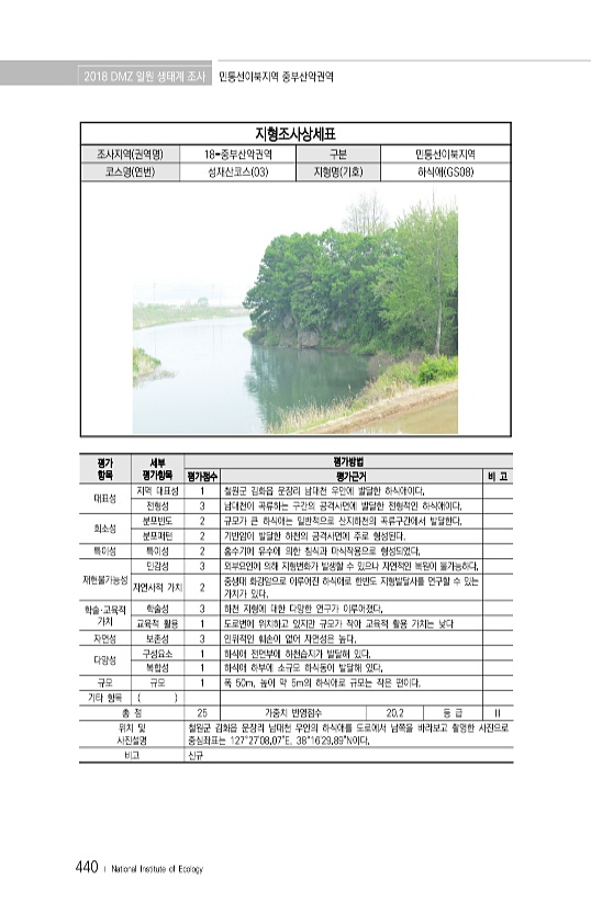 2018 DMZ 일원 생태계 조사 민통선이북지역 중부산악권역 440 ? National Institute of Ecology 지형조사상세표 조사지역 권역명 18-중부산악권역 구분 민통선이북지역 코스명 연번 성재산코스 03 지형명 기호 하식애 GS08 평가 항목 세부 평가항목 평가방법 평가점수 평가근거 비 고 대표성 지역 대표성 1 철원군 김화읍 운장리 남대천 우안에 발달한 하식애이다. 전형성 3 남대천이 곡류하는 구간의 공격사면에 발달한 전형적인 하식애이다. 희소성 분포빈도 2 규모가 큰 하식애는 일반적으로 산지하천의 곡류구간에서 발달한다. 분포패턴 2 기반암이 발달한 하천의 공격사면에 주로 형성된다. 특이성 특이성 2 홍수기에 유수에 의한 침식과 마식작용으로 형성되었다. 재현불가능성 민감성 3 외부요인에 ...